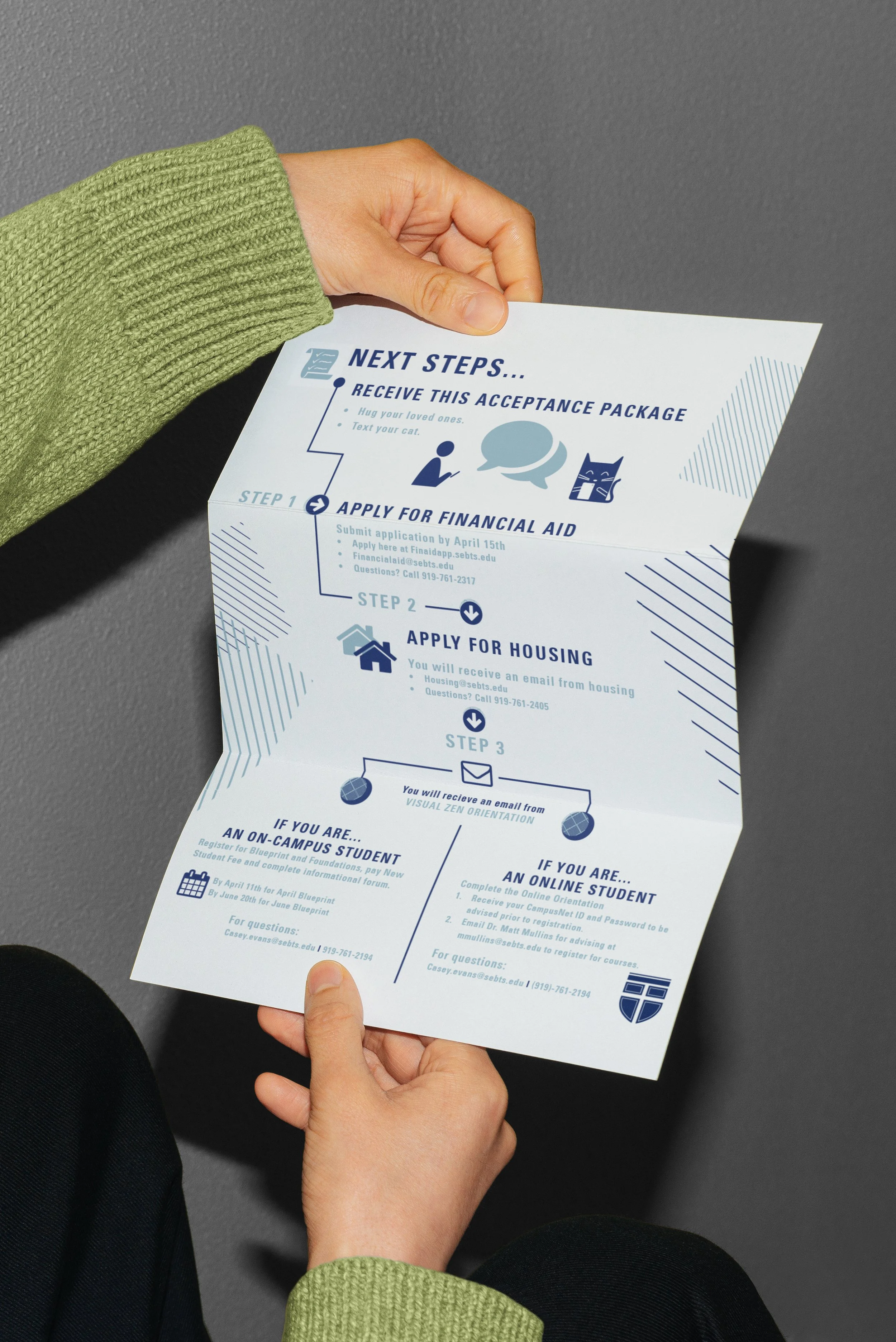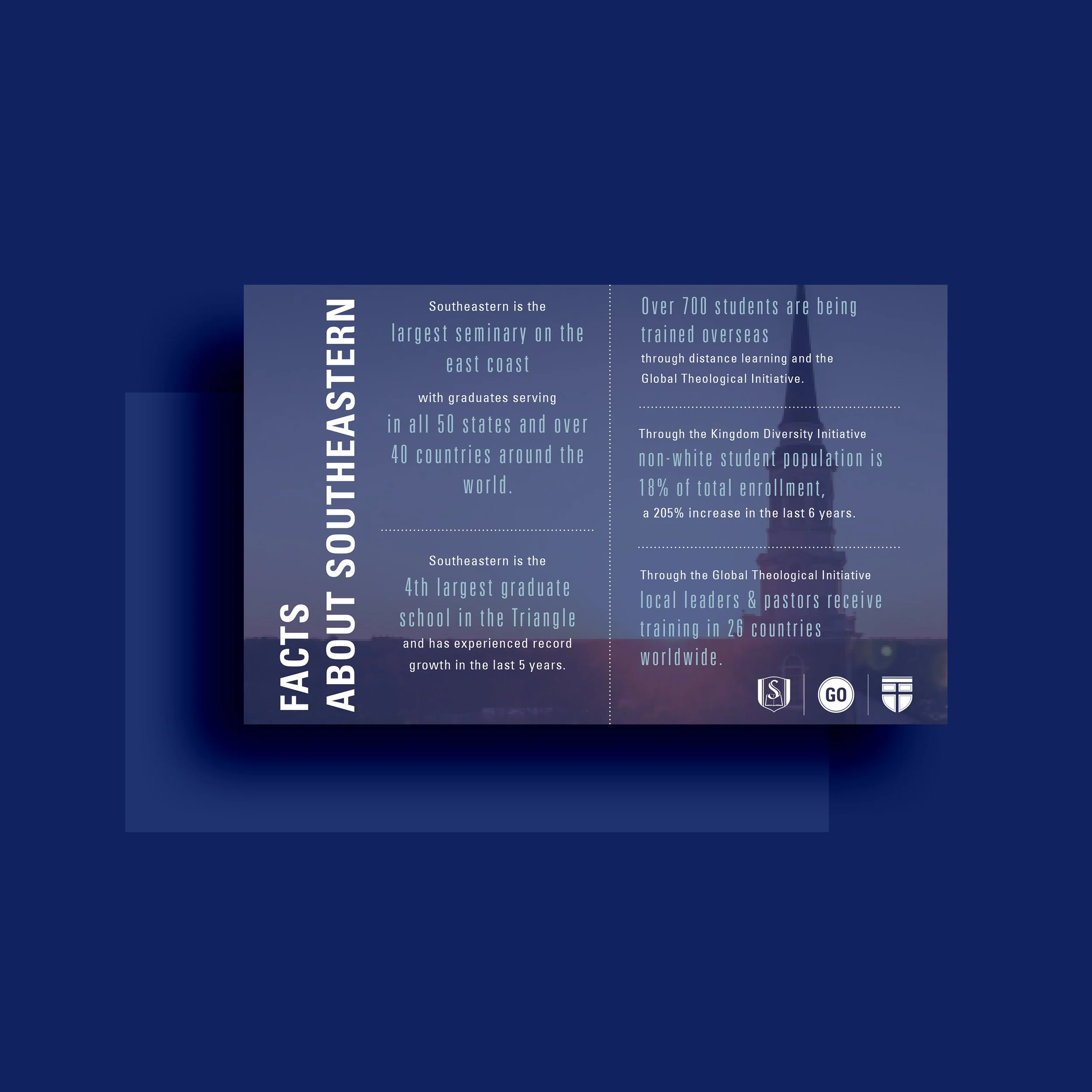 While working for the Marketing and Communications department as a junior graphic designer for SEBTS, I was given the task of creating strategic print and digital marketing materials. By utilizing brand standards and guidelines of the university, I designed new posters, flyers, mailers, digital presentations, layouts, updated booklets and official institutional paperwork.